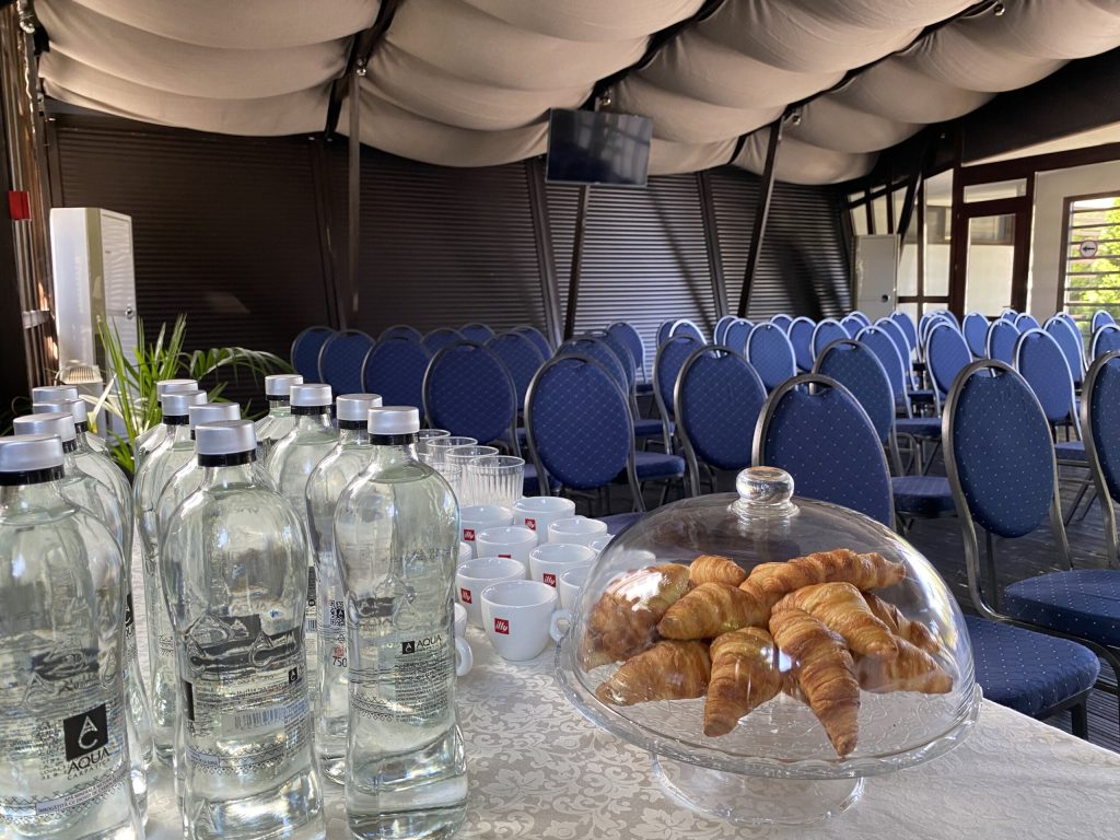 Pentru a garanta siguranța alimentară și calitatea serviciilor, nu acceptăm catering extern. Hotel Ambiance dispune de bucătărie proprie și vă putem oferi meniuri de coffee break și prânz foarte variate, inclusiv opțiuni vegetariene sau de post.