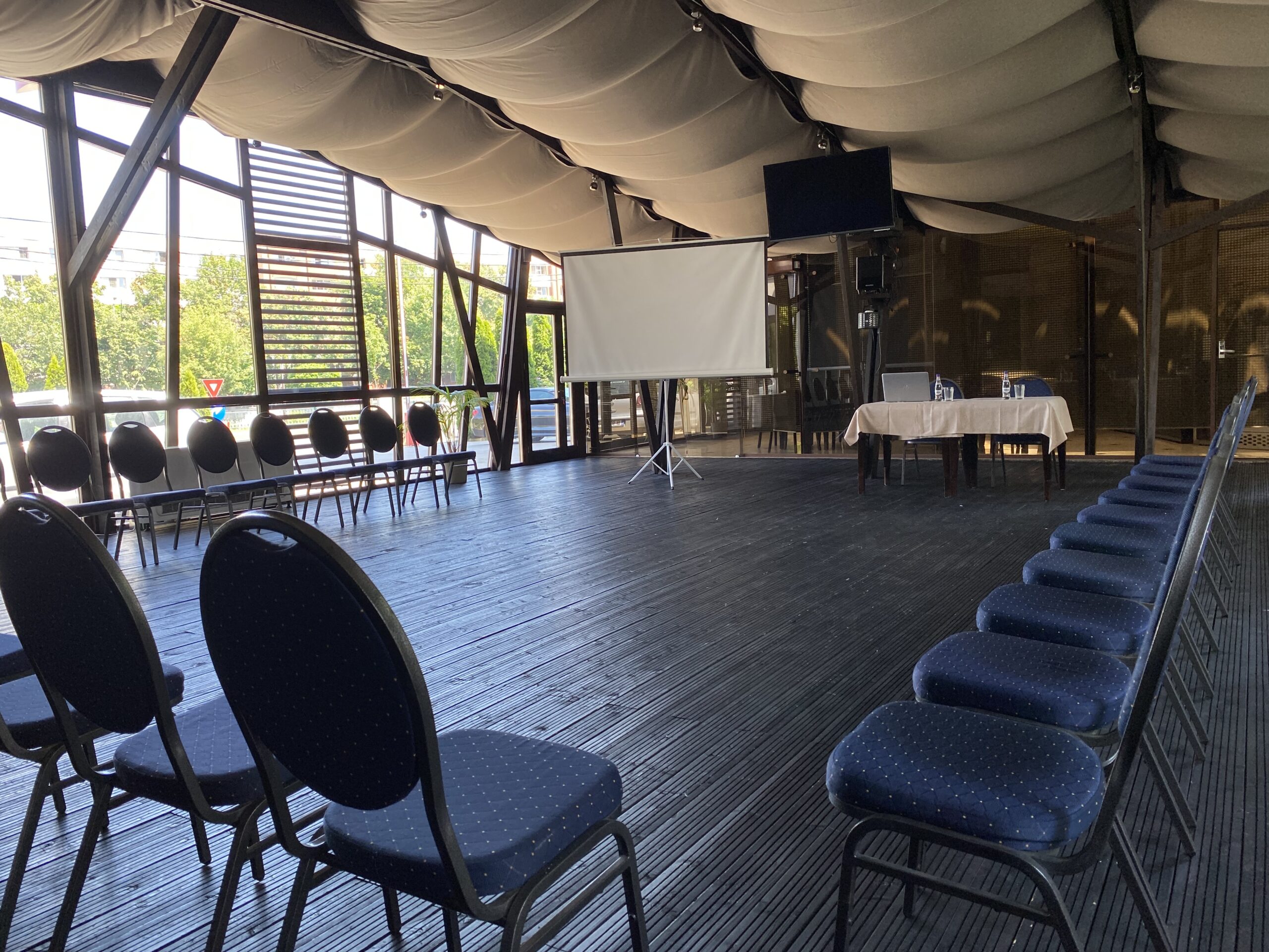 Sala noastră a fost proiectată special pentru a elimina senzația de "spațiu închis". Pereții vitrați, tavanul drapat și lumina naturală abundentă mențin energia participanților ridicată pe tot parcursul zilei, fie că organizezi un training, un workshop sau o ședință de strategie..